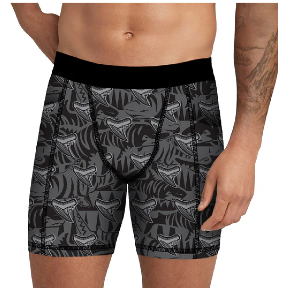 Be the Apex Predator with our newest Tiger Shark print, featuring a geometric tribal maze of sharks and sharp teeth.